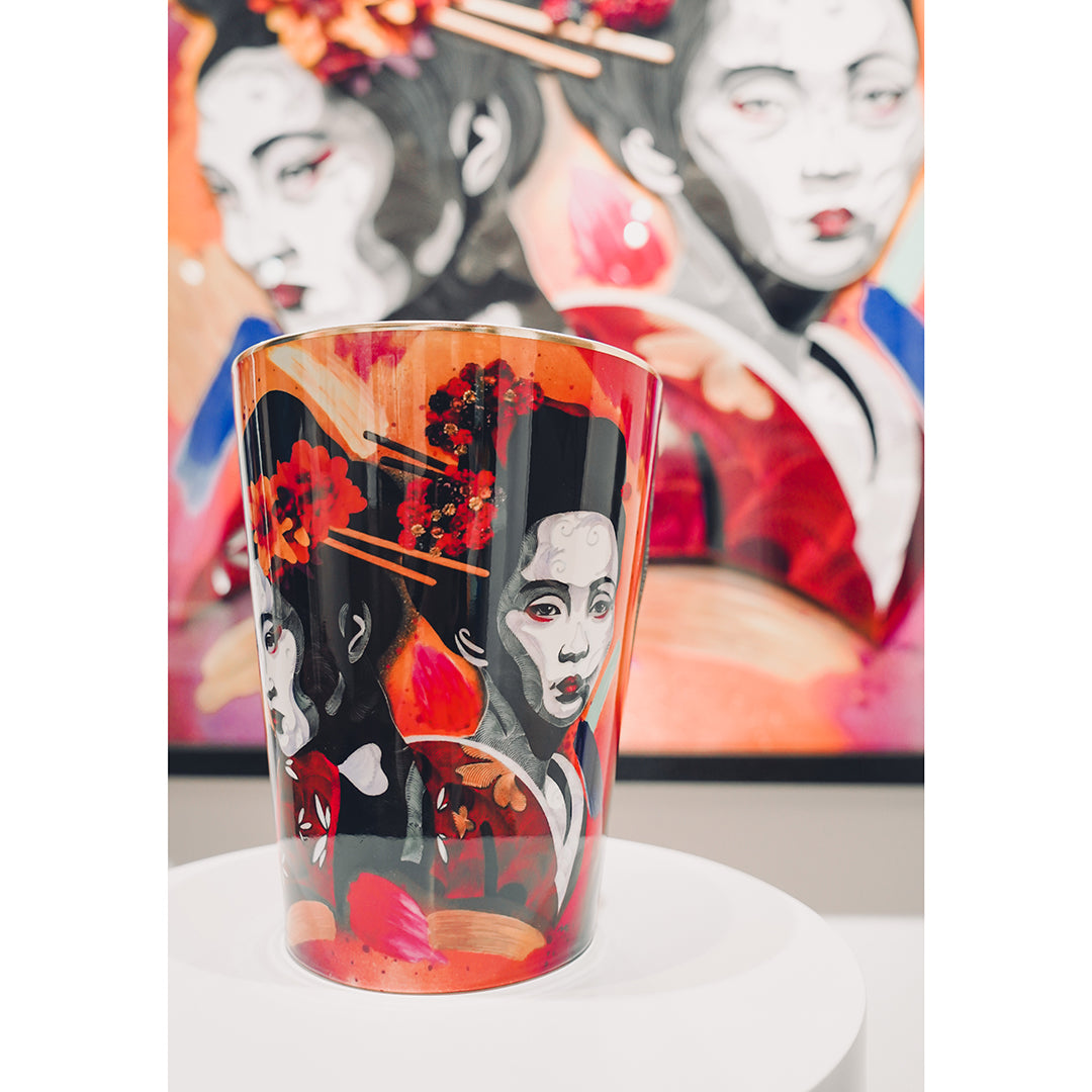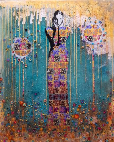 His work is about the enquiry of humanity from the cosmogony of the female form, bearer of life and mystery. His female form is recognised as a source of knowledge and harmony perpetuating wisdom and balance. Each piece has a strong story, a collage of symbols and meanings. The mosaic patterns, inspired by Klimt’s technique, represent the integration of human mind: thoughts and emotions, which in turn creates our reality.