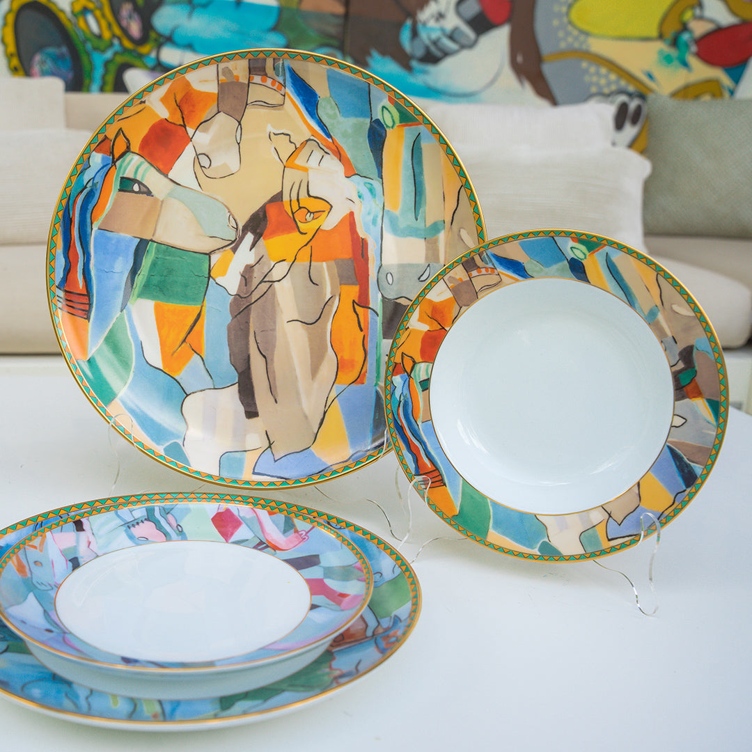 She Interweaves the richness of Mexican culture with the symbolic iconography of equestrian motives. Her graceful pastel palette combined with bold brush strokes has resulted in an interlocking collage rich in depth and beauty. Her contemporary twist of cubism and primitive techniques creates a rich tapestry of mythical motives of angular horses showing a strong sense of effervescence.