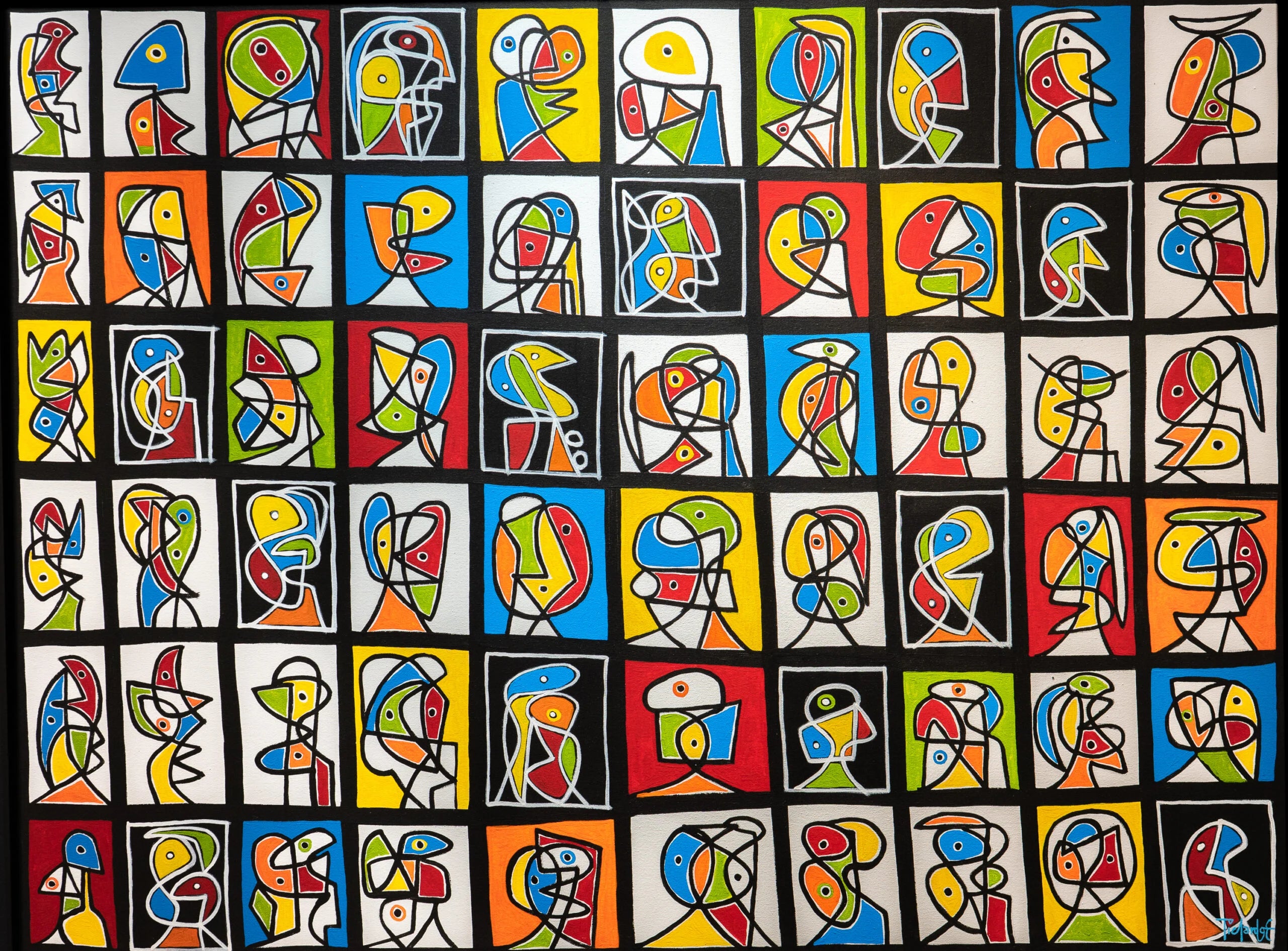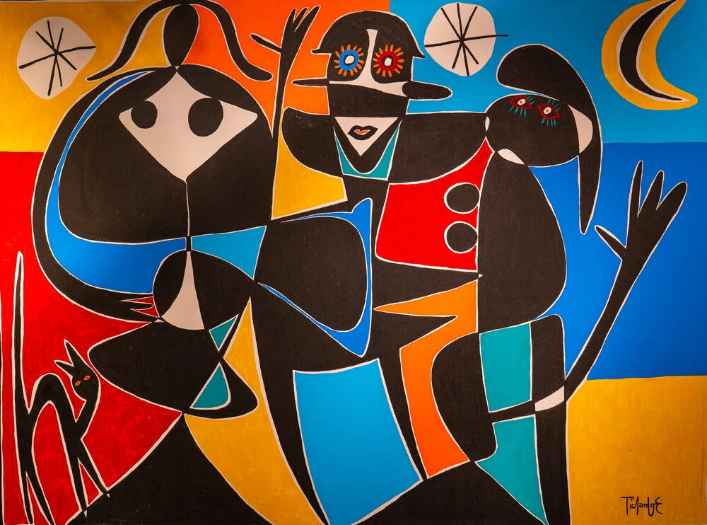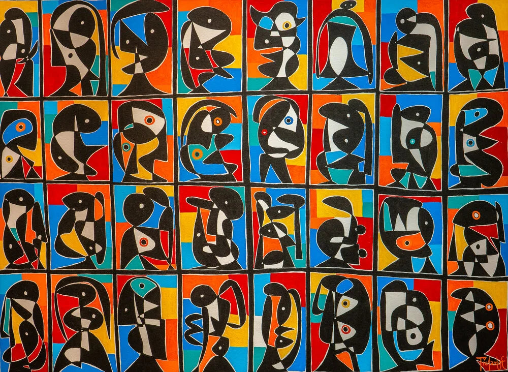 Pichardo’s artworks are primarily figurative, in a liner form, often whimsical or with a child-like innocence. His vibrant colour tones, striking plains of block colour, pictorial signs, biomorphic forms and geometric shapes demonstrate inspiration from the great Modern European artists Juan Miro and Pablo Picasso.